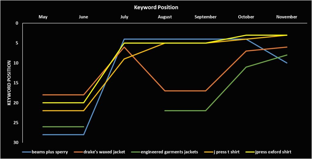 Keyword performance became the clearest early indicator of the site’s accelerating momentum. What began as a scattered visibility profile—keywords sitting between positions 18 and 28 in May—quickly transformed into a dominant presence across high-intent product clusters. By July, flagship queries such as “jpress oxford shirt,” “j press t shirt,” and “beams plus sperry” surged into the top 3–6 positions, securing premium ranking real estate normally reserved for top-tier UK retailers. Even more competitive branded queries, including “drake’s waxed jacket” and “engineered garments jackets,” climbed steadily into the 8–14 range by November. Notably, despite the heavy August rollout—typically a period of algorithmic turbulence—rankings not only held steady but continued strengthening, signalling the resilience and precision of the new SEO architecture.